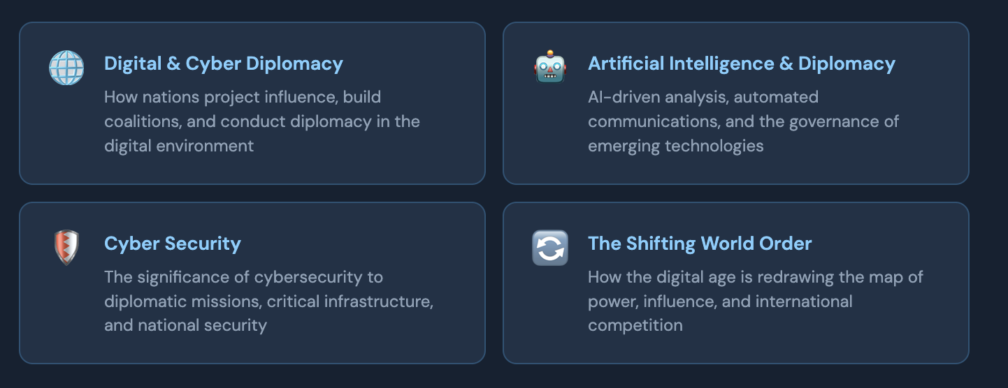 La tecnología digital ha transformado radicalmente la forma en que las naciones se comunican, proyectan su influencia y llevan a cabo la diplomacia. Desde la gestión política en las redes sociales y el análisis basado en la inteligencia artificial hasta las amenazas cibernéticas y la gobernanza de las plataformas, el ámbito digital es ahora inseparable de la política exterior.