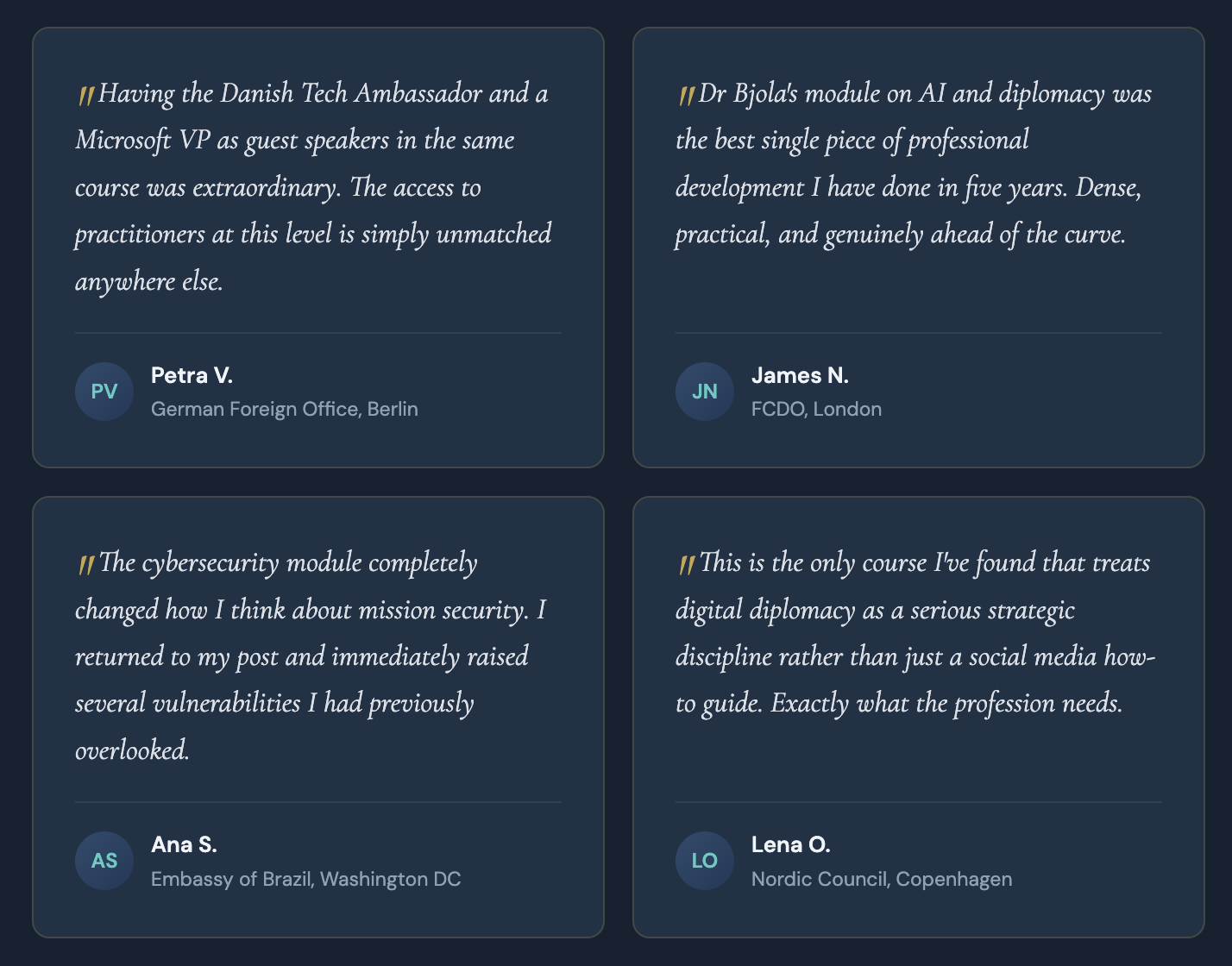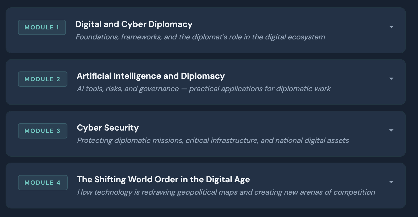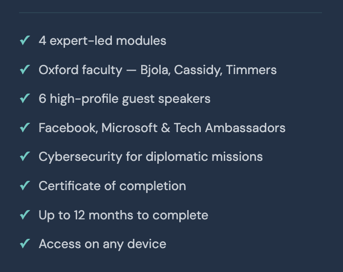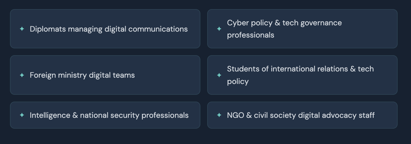 Este curso va más allá de los conceptos básicos de las redes sociales y enseña a los participantes cómo desarrollar e implementar estrategias digitales con un impacto diplomático tangible, contando con la participación de profesores de Oxford, líderes de Silicon Valley y embajadores tecnológicos en activo que están dando forma a este campo en tiempo real.
