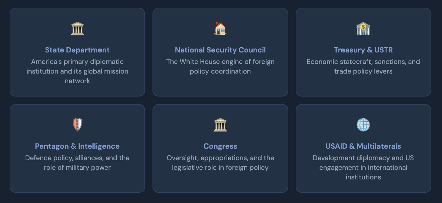 La política exterior de ningún país es más importante para el resto del mundo que la de Estados Unidos. Con ocho módulos completos, más que cualquier otro curso de la GDF Academy, este curso ofrece una visión completa de cómo Estados Unidos formula, debate y ejecuta su estrategia global: desde los fundamentos constitucionales y la maquinaria burocrática hasta la política económica, el poder militar y la rivalidad determinante con China.
